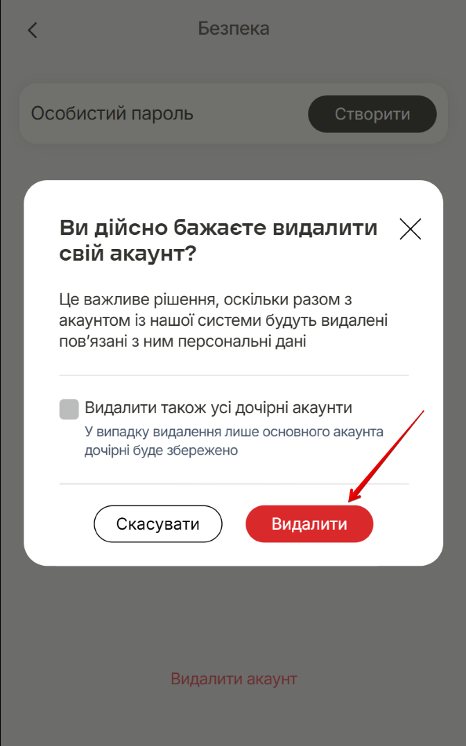 На сторінці Безпека, що відкрилася, натисніть кнопку Видалити акаунт