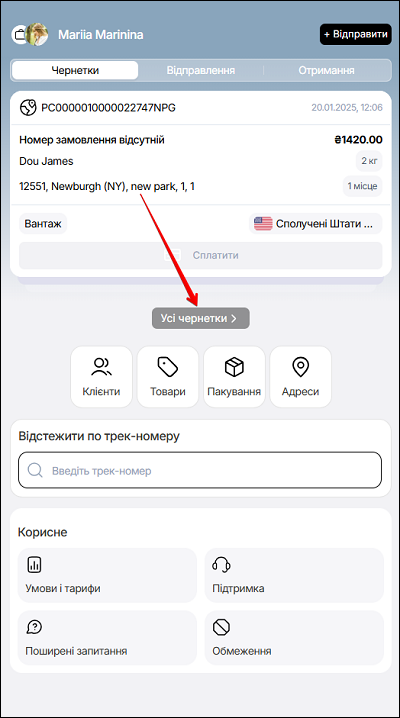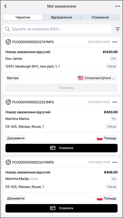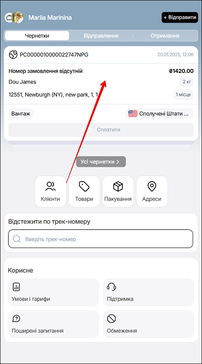 В десктопній версії функція пошуку за номером віправленя доступна на сторінці Чернетки. Введіть номер замовлення в поле Пошук за номером замовлення. Щоб відмінити пошук - натисніть кнопку Скасувати.