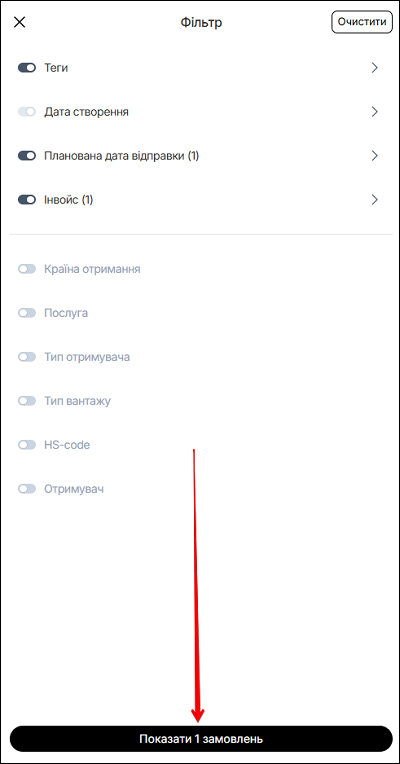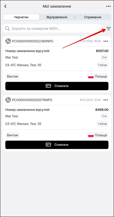 Також доступна функція пошуку за номером МЕН. У полі Шукати за номером МЕН введіть номер експрес накладної. Щоб видалити пошук - натисніть іконку ✖️.