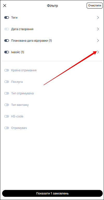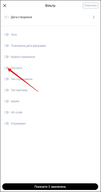 Щоб налаштувати фільтри в мобільній версії - активуйте, за допомогою перемикача, необхідні фільтри з переліку: