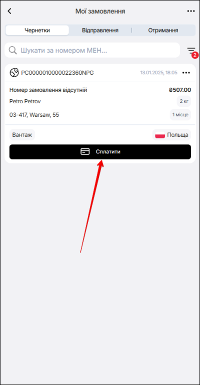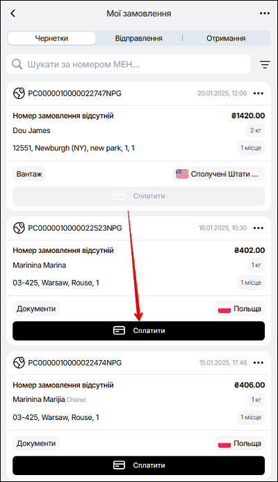 В мобільній версії доступна функція Сплатити. Щоб зробити оплату відправлення - атисніть кнопку Сплатити.