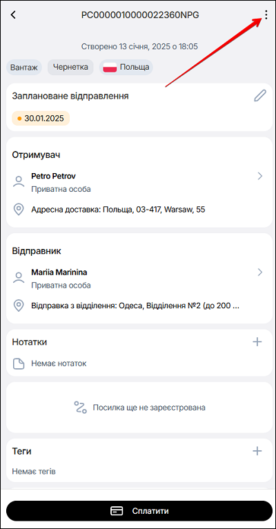 Натисніть на потрібну чернетку. Відкриється сторінка чернетки з інформацією про замовлення. Натисніть на три крапки, щоб відкрити меню додаткових дій.