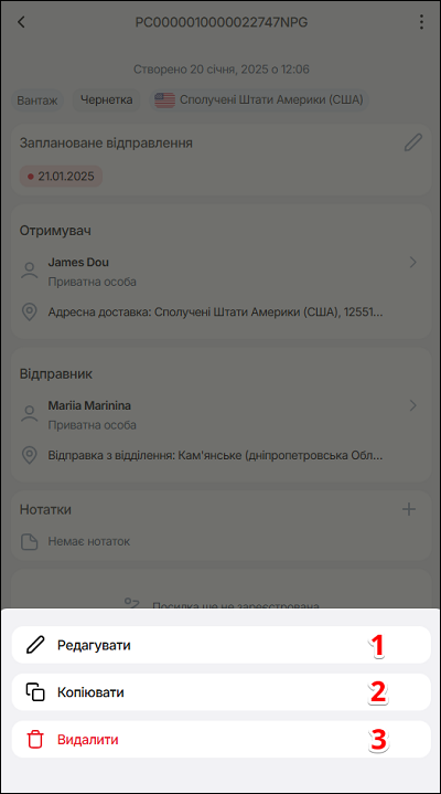 2Копіюватикопіювати інфрмацію про замовлення, що дозволяє швидко створити нову посилку, змінивши лише необхідну інформацію