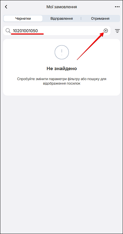 Якщо чернетку з введеним номером МЕН не знайдено - змініть параметри фільтру або пошуку для відображення посилок
