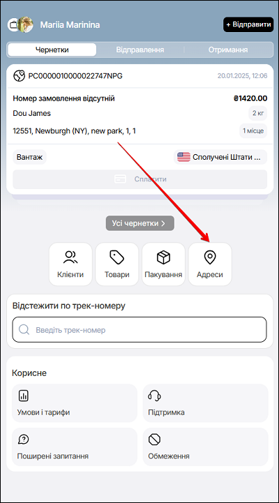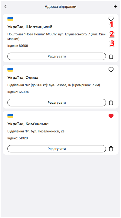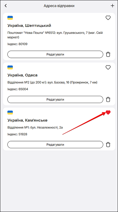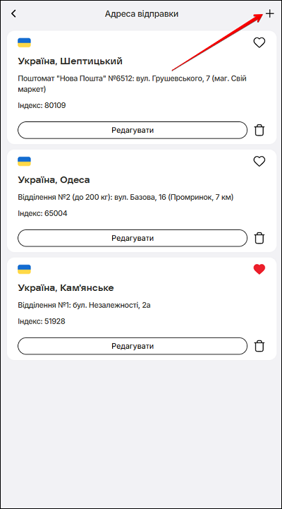 Щоб додати нову адресу - натисніть іконку ➕. Додану нову адресу відправлення можна використовувати при створенні нових відправлень.