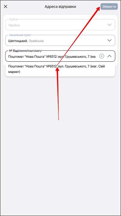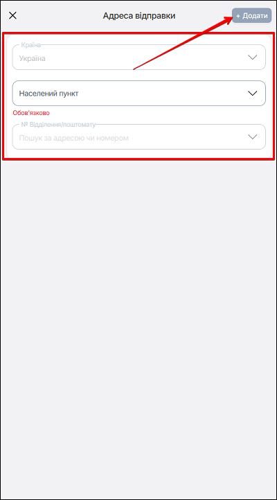 В мобільній версії у вікні Адреса відправки введіть нову адресу, та натисніть кн опку +Додати.
