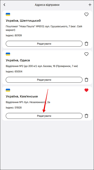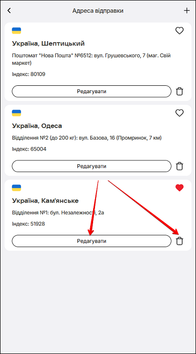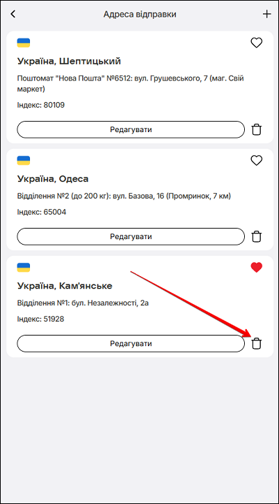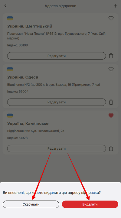 Інформацію про адресу відправки можна редагувати або видаляти. Натисніть на три крапки у кінці рядка, та у спливаючому вікні натисніть відповідну кнопку Редагувати/Видалити.