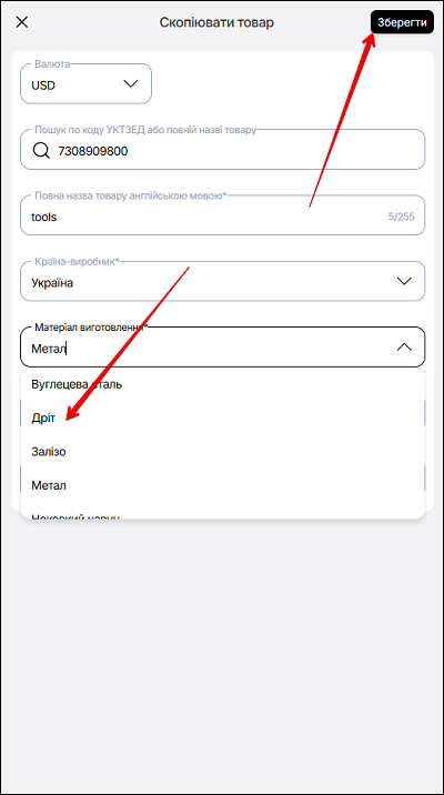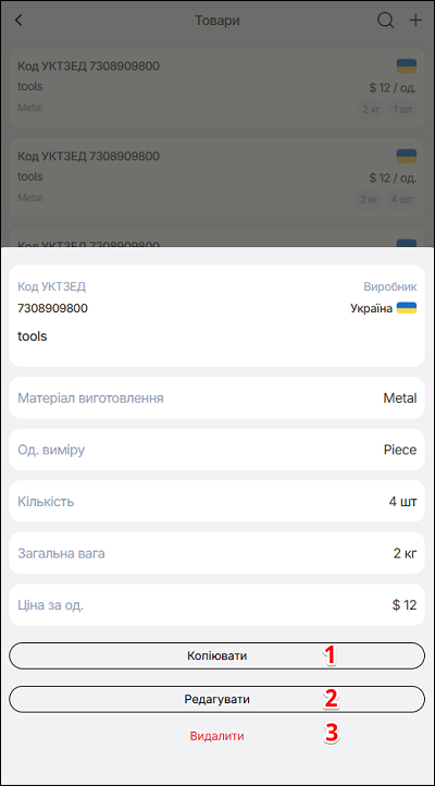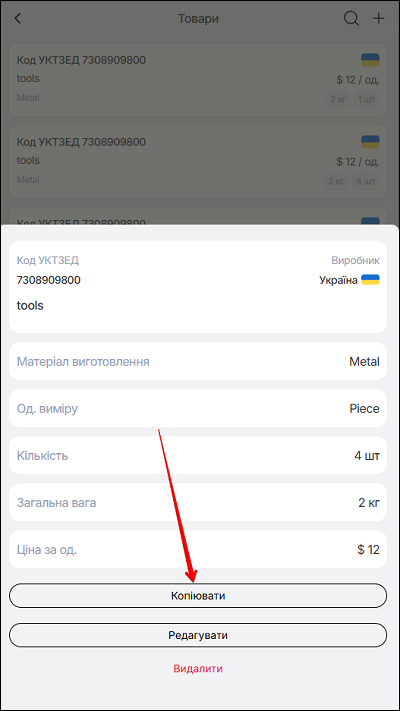Якщо обрана дія Копіювати - натисніть кнопку Копіювати. У спливаючому вікні змініть дані про товар (за потребою), та натисніть кнопку Зберегти.