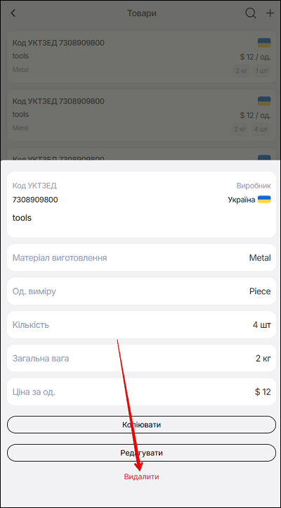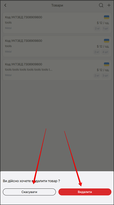 - видалити. Натисніть поле позиції, зі списку товарів.