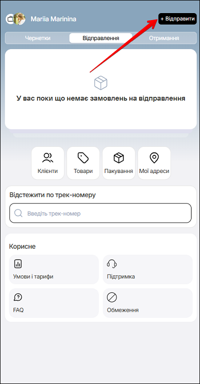 В мобільній версії, щоб створити нове відправлення - натисніть кнопку +Відправити.