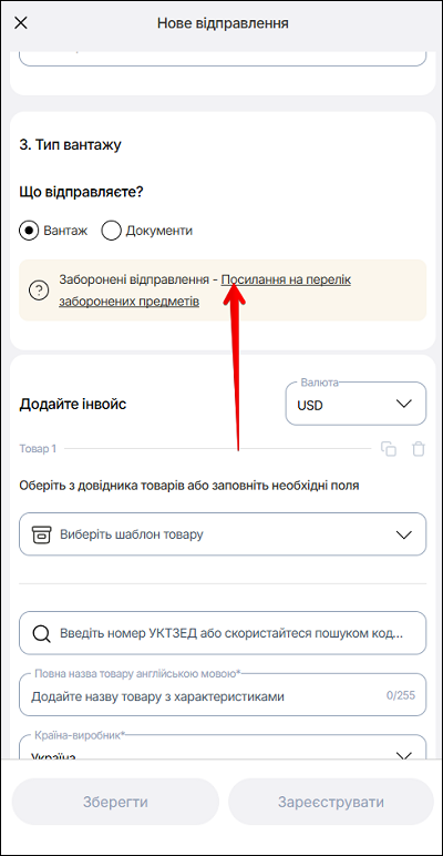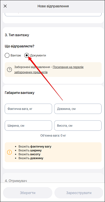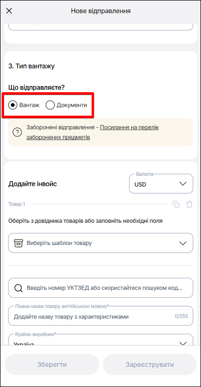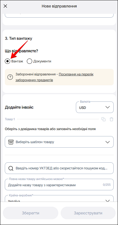 На даному кроці необхідно обрати тип вантажу — Вантаж або Документи.