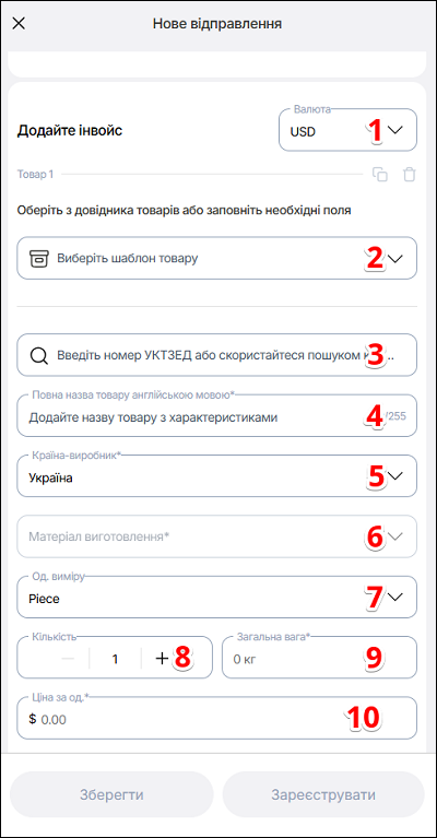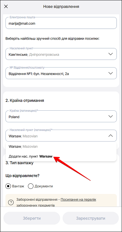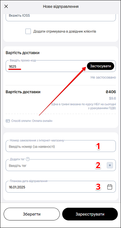 Щоб зберегти або зареєструвати відправлення - натисніть кнопку Зберегти /Зареєструвати відповідно дії.