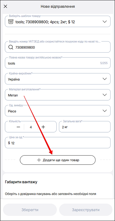 Щоб додати ще один товар - натисніть кнопку +Додати ще один товар.