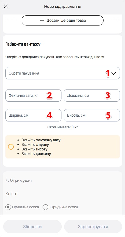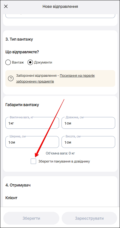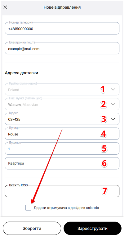 Відмітьте чек бокс Додати отримувача в довідник клієнтів, якщо необхідно додати отримувача в довідник для використання в наступних відправках.