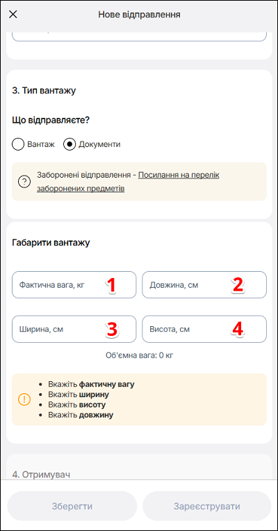 Після вказання способу доставки стає доступним Крок 3 – Габарити вантажу.