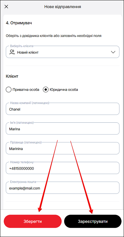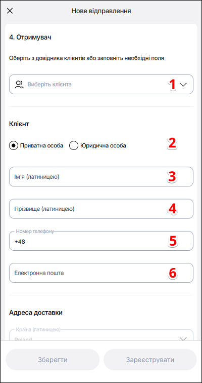 Ця адреса одночасно автоматично підв'язується до клієнта, та додається до Кроку 4 Отримувач.
