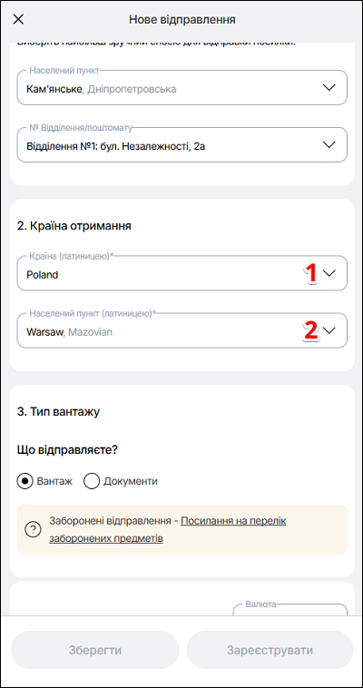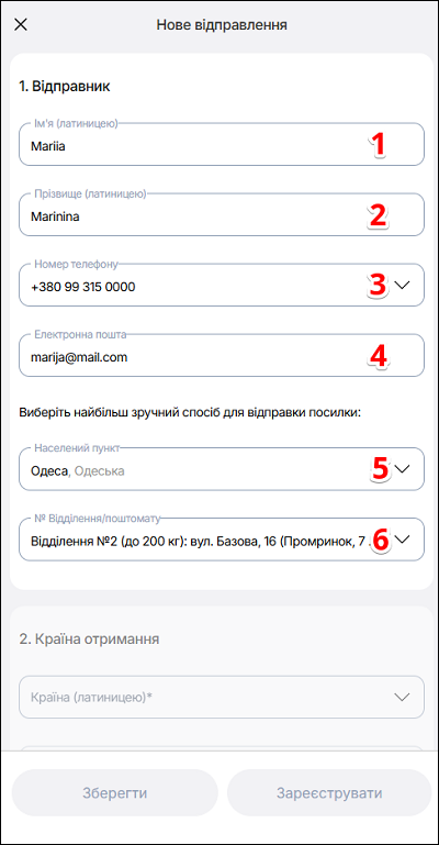 Після внесення даних відправника перейдіть до Кроку 2 – Країна отримання.