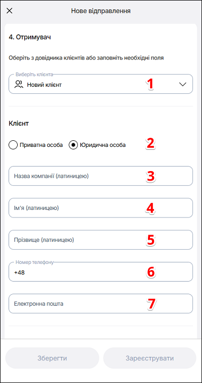 Щоб внести інформацію про отримувача, оберіть отримувача з довідника клієнтів та оберіть тип клієнта.