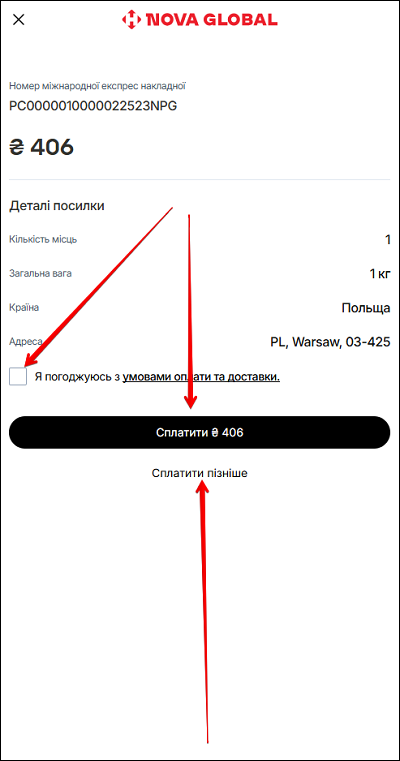 Перевірте інформацію про відправлення, та відмітьте чек бокс, якщо погоджуєтеся з умовами оплати та доставки, натиснувши Сплатити або Сплатити пізніше.