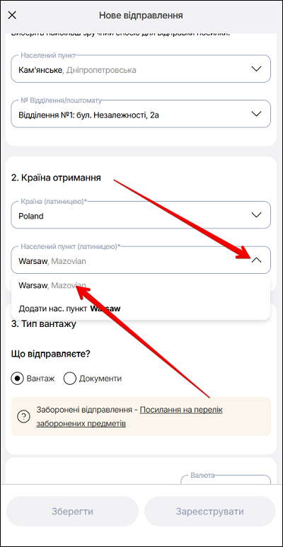 На даному кроці необхідно обрати країну та місто доставки. Для цього виконайте наступні дії: