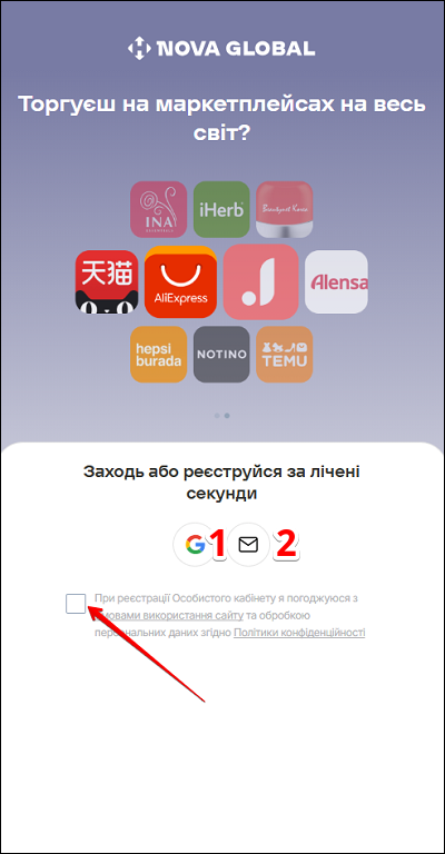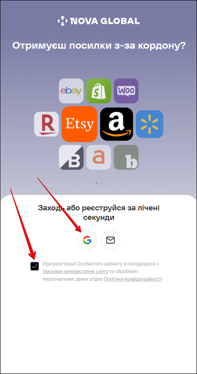Щоб авторизуватися через Email - поставте позначку у чек боксі, якщо погоджуєтеся з умовами, та натисніть іконку ✉️.