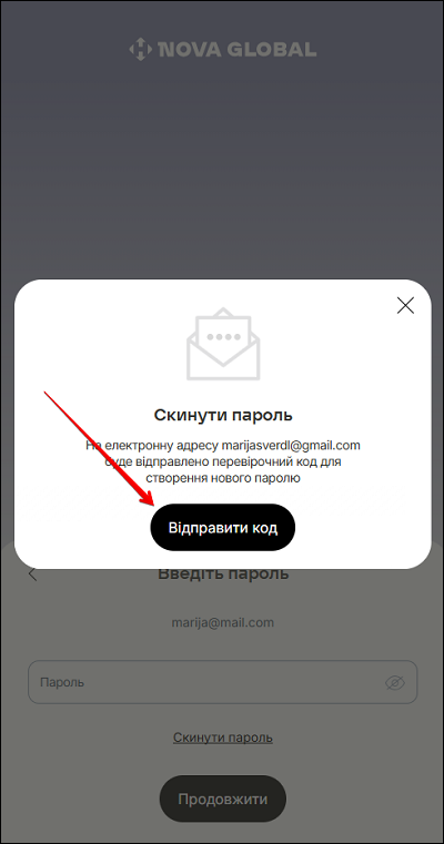 На електронну адресу, вказану раніше, буде відправлено перевірочний код, для створення нового паролю