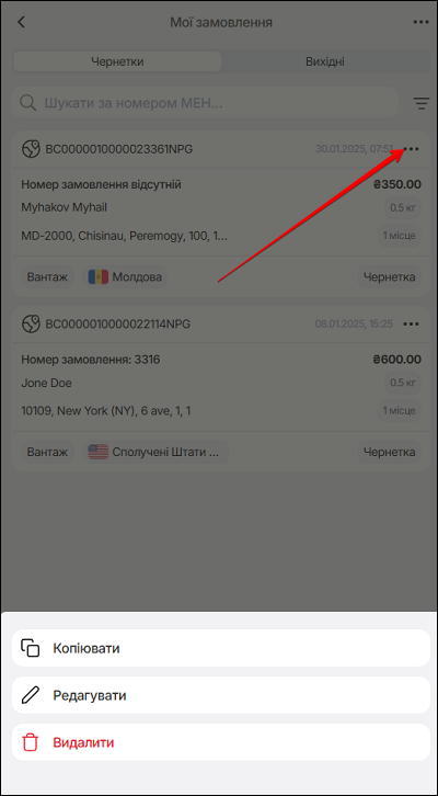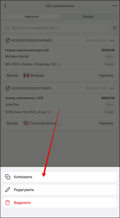 Щоб створити нову посилку, використовуючи дані існуючої - натисніть кнопку Копіювати. Це дозволить швидко створити нову посилку, змінивши лише необхідну інформацію.