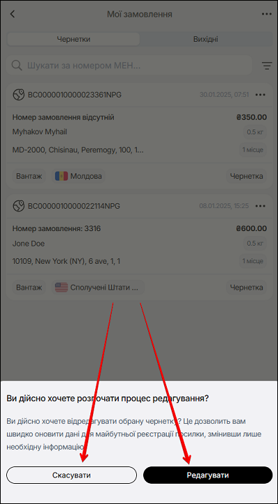 Для редагування будь якої інформації про замовлення - натисніть поле Редагувати. Це дозволить швидко оновити дані для майбутньої реєстрації посилки, змінивши лише необхідну інформацію.