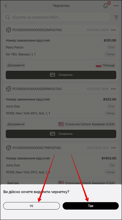 Якщо обрана дія Видалити посилку - натисніть кнопку Видалити. У випадаючому вікні натисніть кнопку Так/Ні, відповідно дії.