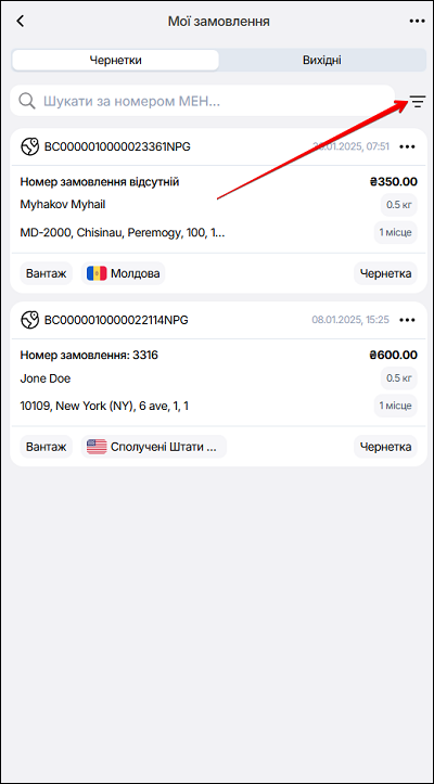 В десктопній версії відфільтровані замовлення відкриються на сторінці Чернетки.