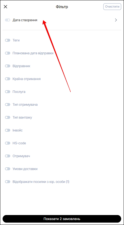 Відкриється сторінка Фільтр - натисніть поле Дата створення.