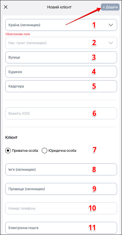 | 7 | Дані клієнта | Вкажіть статус клієнта Приватнаособа/Юридична особа |