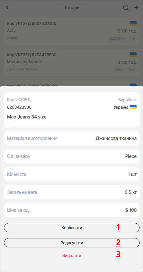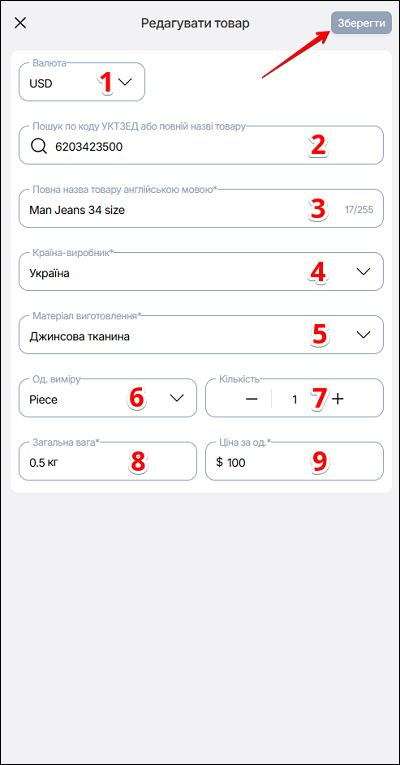 Якщо обрана дія Редагувати, у спливаючому вікні змініть дані про товар (за потребою), та натисніть кнопку Зберегти.
