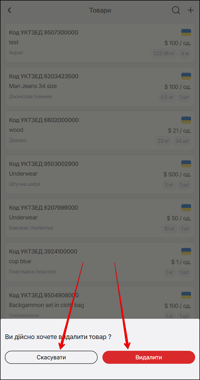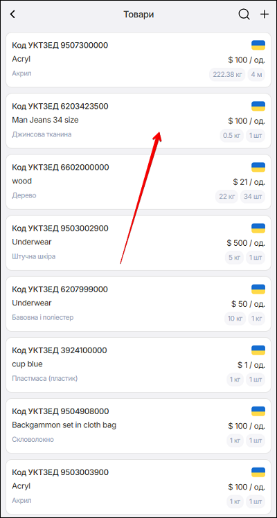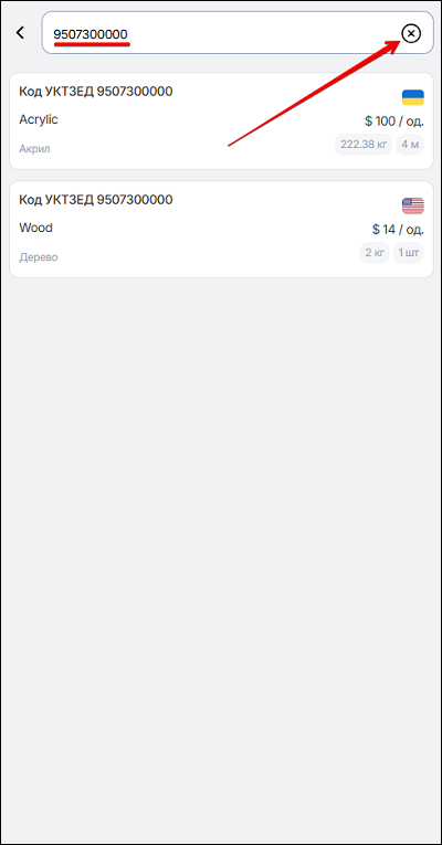 Почніть вводити потрібну інформацію (коду УКТЗУД або повну назву товару). Відкриється список з введеними данними. Щоб завершити пошук - натисніть на іконку ✖️.
