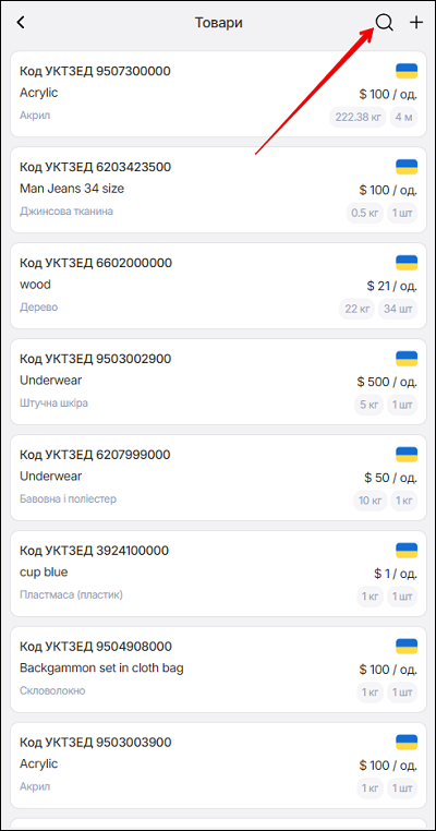 У цоьму списку також можна вести пошук по Коду УКТЗУД або повній назві товару. Щоб розпочати - натисніть у полі Пошук іконку Пошук.