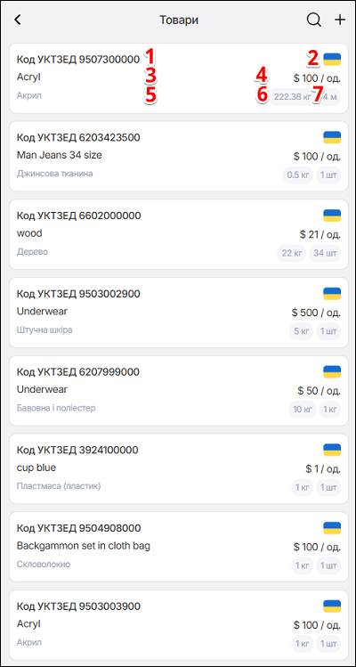 Щоб розпочати пошук - у полі Пошук, натисніть іконку Пошук, та почніть вводити потрібну інформацію (код УКТЗУД або повну назву товару). Відкриється список з введеними данними. Щоб завершити пошук - натисніть кнопку Скасувати.