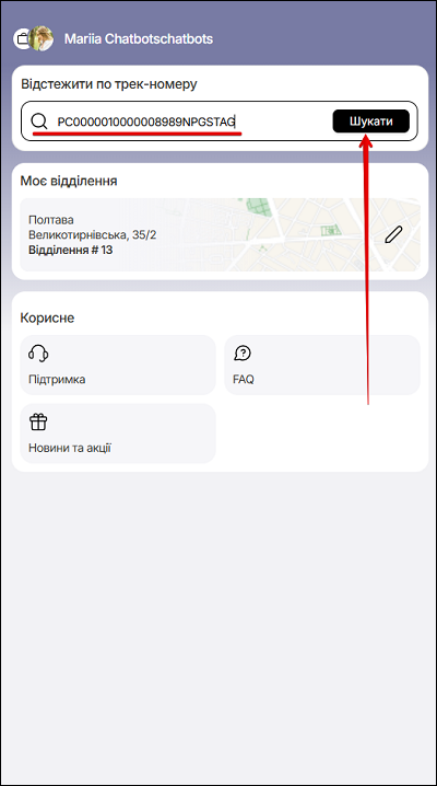 В мобільній версії, у блоці Відстежити по трек-номеру, можна переглянути, на якому етапі доставки знаходиться замовлення. Введіть Трек-номер замовлення, та натисніть кнопку Шукати.